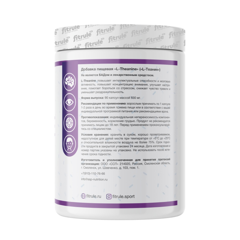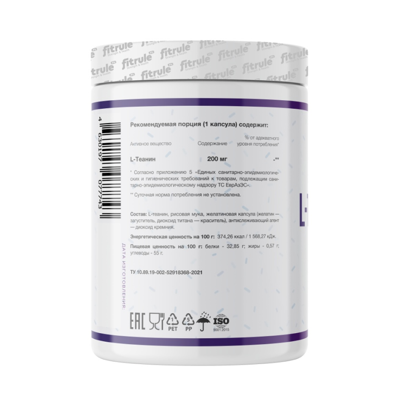 Состав: L-теанин, рисовая мука, желатиновая капсула (желатин — загуститель, диоксид титана — краситель), антислеживающий агент — диоксид кремния.