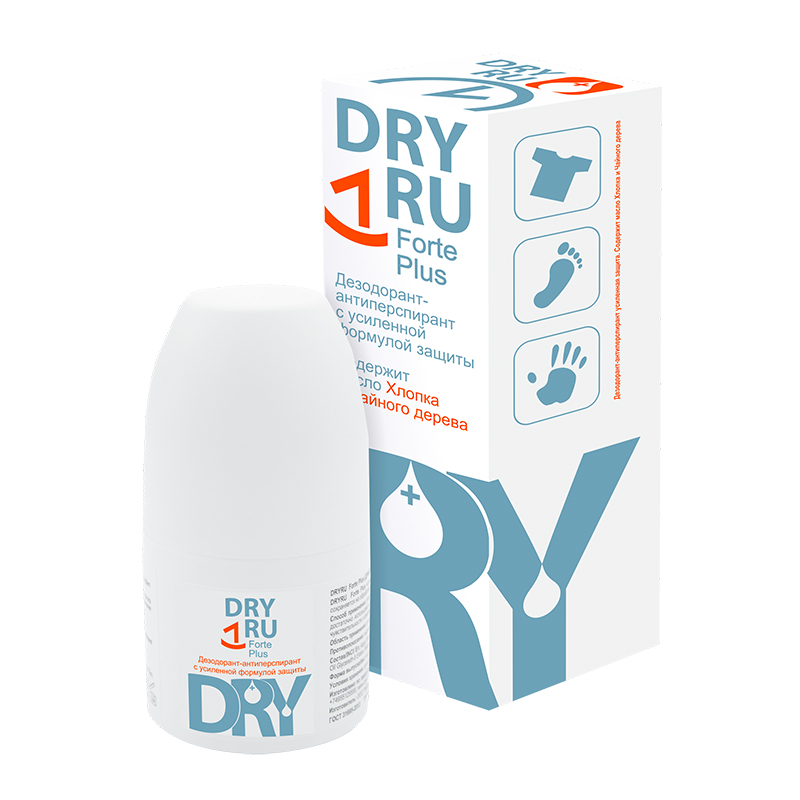 Область применения: дезодорант - антиперспирант Dry RU Forte Plus применяется в подмышечных впадинах, на ладонях и ступнях.