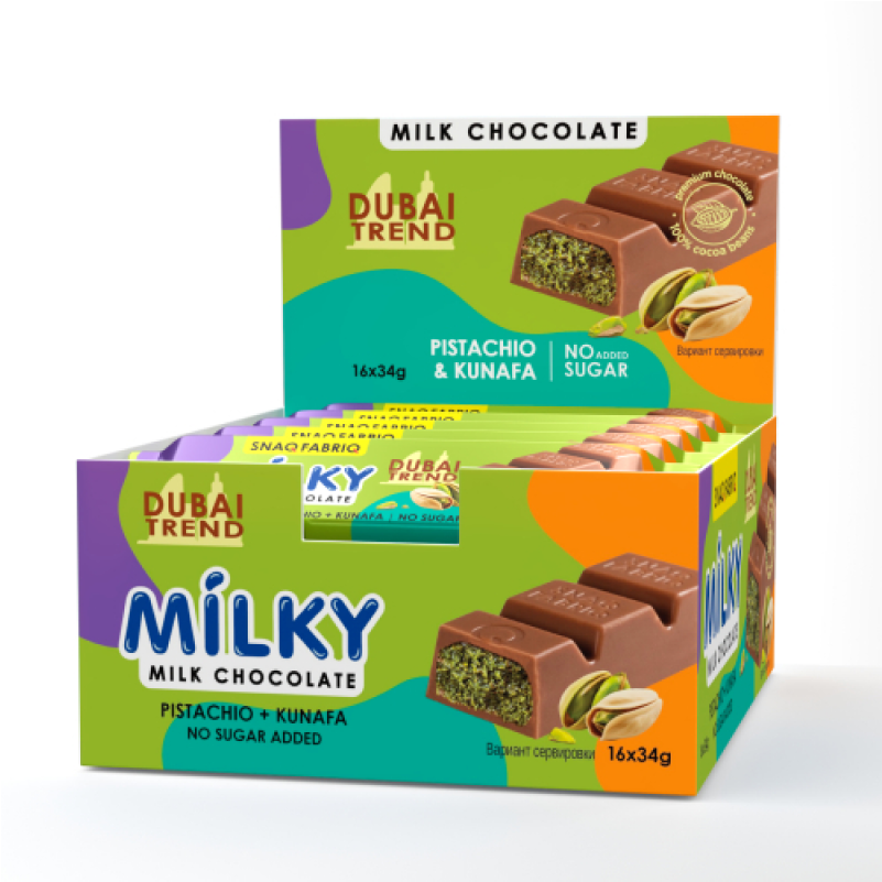 Молочный шоколад (водорастворимые волокна кукурузы, какао масло, какао тертое, молоко сухое обезжиренное, эмульгатор (соевый лецитин), ароматизаторы натуральные, подсластитель (сукралоза)), начинка с фисташковой пастой и хрустящим тестом (фисташковая паста, тесто катаифи (мука пшеничная в/с, крахмал кукурузный, масло растительное, эмульгатор (соевый лецитин), консервант (сорбат калия, соль, вода), масло кокосовое, водорастворимые волокна кукурузы, паста тахини, молоко сухое обезжиренное, эмульгатор (соевый лецитин), ароматизаторы натуральные, подсластитель (сукралоза)).