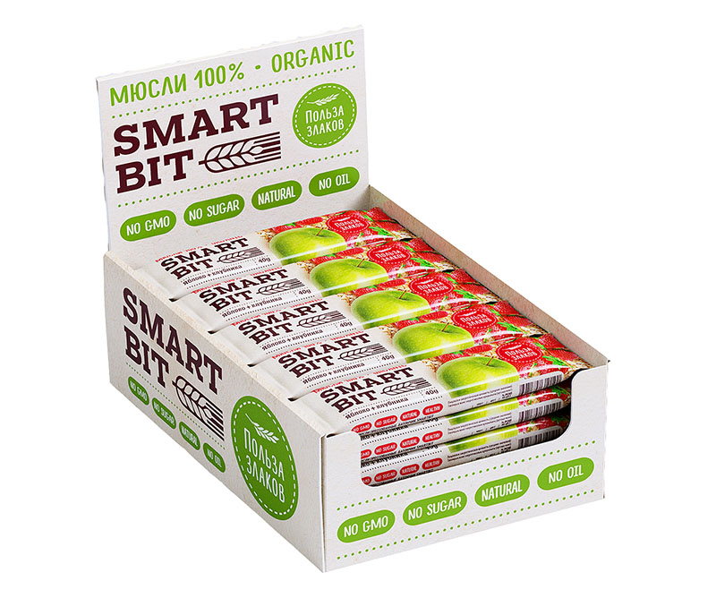 Батончики SMARTBIT изготавливаются из натуральных ингредиентов: цельных злаков, сухофруктов, овощей, ягод и орехов, без добавления сахара и сахарозаменителей, сои, пальмовых масел, трансжиров, крахмала, консервантов, красителей, ароматизаторов, также не содержат ГМО, в ассортименте есть линия батончиков без глютена. SMARTBIT («умный кусочек» – пер. с англ.) – для тех, кто с умом выбирает, даже то чем перекусить. Батончики SMARTBIT – это: Источник полезных углеводов и белка Здоровый способ утоления голода Энергия и силы Полезная альтернатива вредной сладости Правильный перекус для всех: для тех, кто много работает, кто много думает, для спортсменов, вегетарианцев, молодых мамочек, студентов…