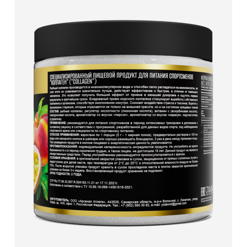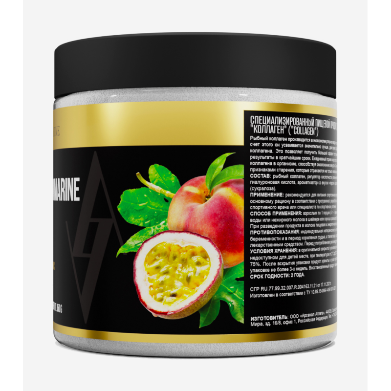 Рыбный коллаген, регулятор кислотности (лимонная кислота), витамин С (аскорбиновая кислота), гиалуроновая кислота, ароматизатор со вкусом «персик», ароматизатор со вкусом «маракуя», подсластитель (сукралоза).