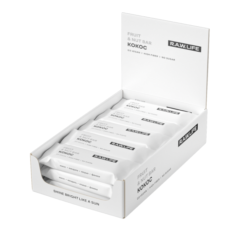R.A.W. LIFE® — это орехово-фруктовые батончики, созданные из 100% натуральных ингредиентов. Без ГМО, глютена, консервантов и сои. Батончики R.A.W. LIFE® — уникальный продукт, в составе которого отборные финики, орехи и сухофрукты. Великолепная углеводная загрузка без вреда для здоровья. В линейке вкусов есть также два протеиновых батончика, аналогов по составу которым вы не найдете. При производстве батончиков R.A.W. LIFE® не используются технологии термообработки, а полезные свойства продукта бережно защищает трехслойная упаковка, которая легко подвергается переработке. Батончики R.A.W. LIFE созданы для тех, кто уже пришел к осознанному питанию или стремится к нему — жителей городов с активной жизненной позицией, спортсменов, любителей путешествий и походов, людей, привыкших ценить свое время и здоровье. Они также прекрасно подходят вегетарианцам и сыроедам.