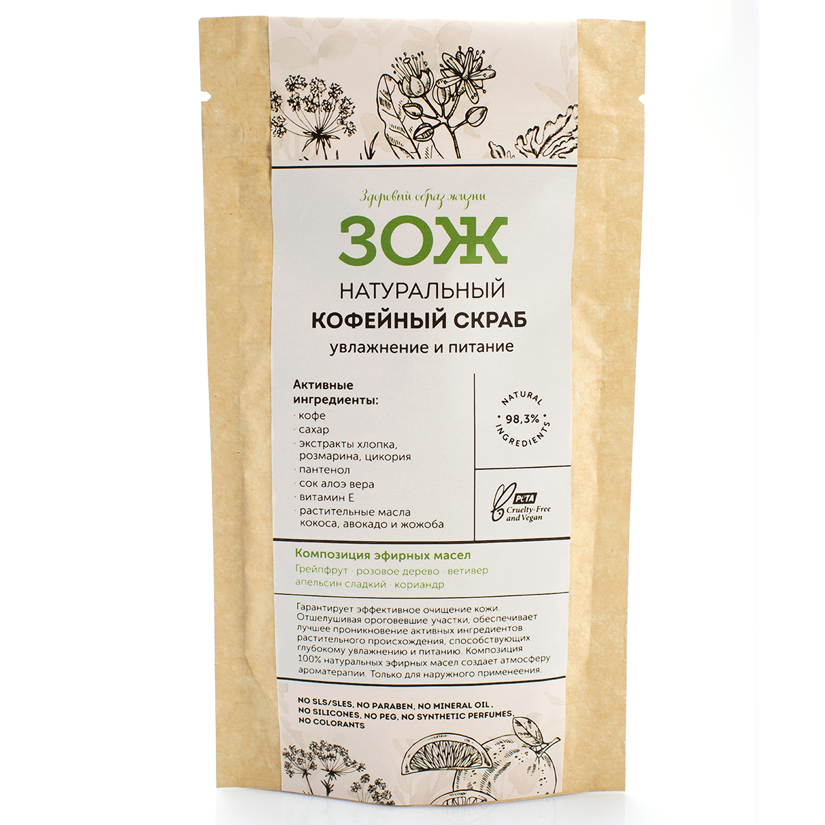- Ингредиенты Молотый кофе, сахар, какао (порошок), экстракт хлопка, экстракт розмарина, экстракт цикория, масло кокоса, масло авокадо, масло жожоба, пантенол, витамин Е, сок алоэ вера, эфирные масла грейпфрута, апельсина сладкого, кориандра, ветивера, розового дерева, лимонен*, линалоол*, гераниол*. *Компоненты натуральных эфирных масел.