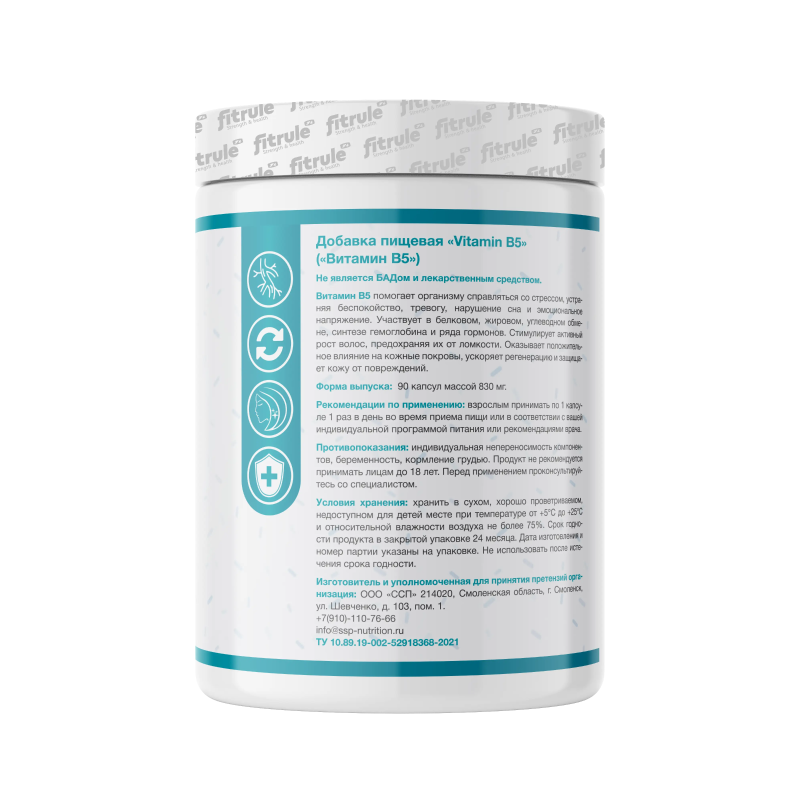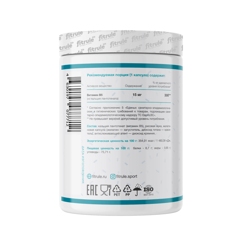 Кальция пантотенат (витамин В5), рисовая мука, желатиновая капсула (желатин — загуститель, вода, диоксид титана — краситель), антислеживающий агент — диоксид кремния.